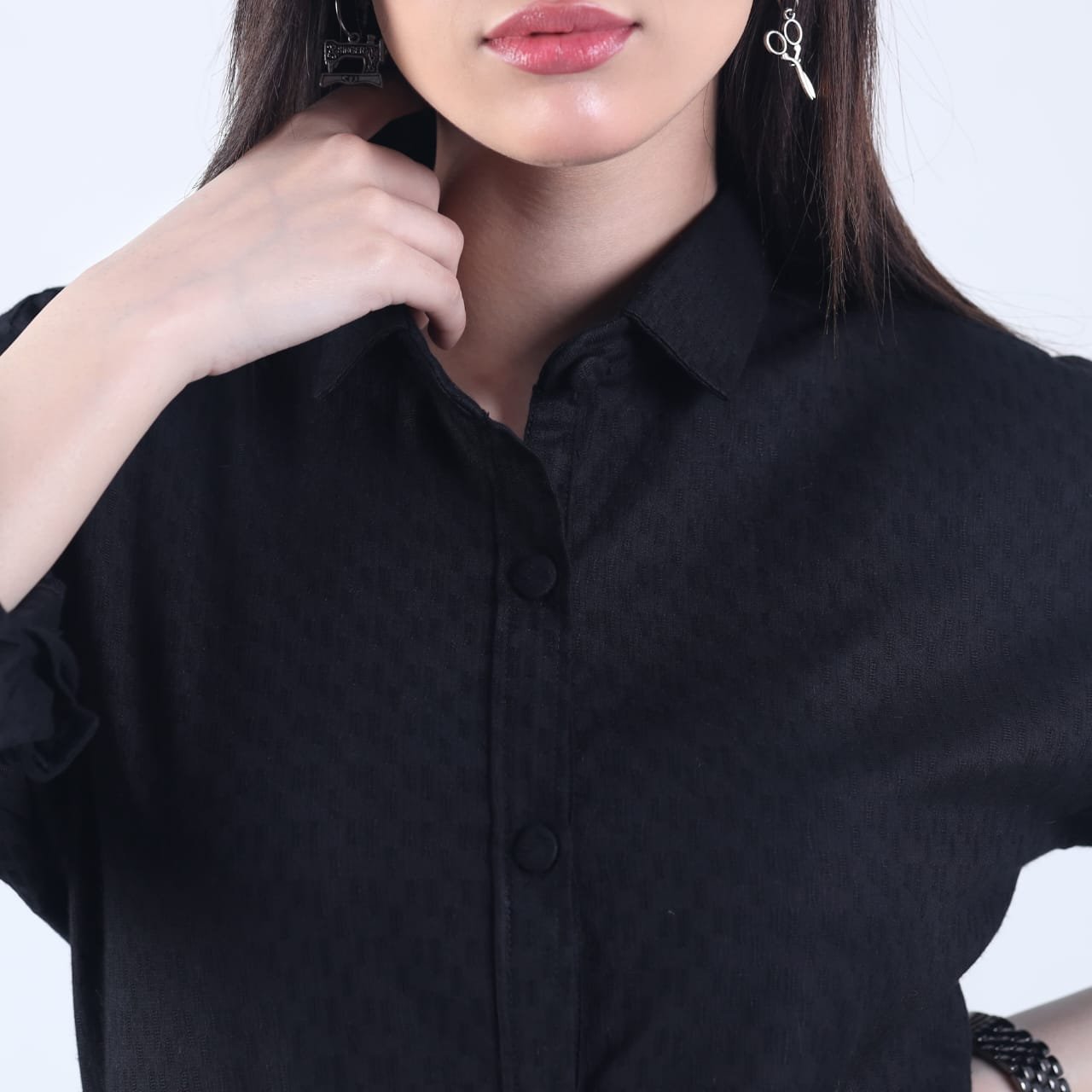 Furthermore, the Black Button Down Shirt uses tone-on-tone fabric buttons. These buttons blend perfectly with the textured fabric. As a result, the shirt has a smooth, streamlined look. This detail contributes to a clean and polished appearance.