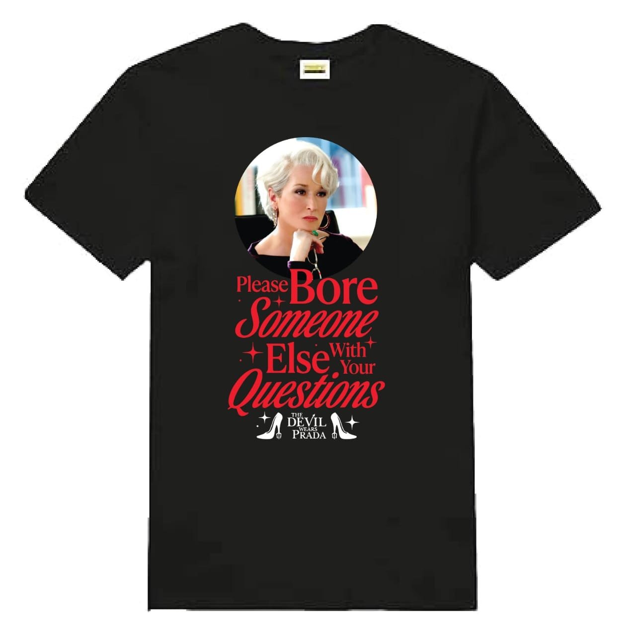 Make a bold fashion statement with this stunning Devil Wears Prada black graphic t-shirt featuring the iconic Miranda Priestly quote: “Please Bore Someone Else With Your Questions.” Printed on a sleek black base with a striking red mixed-typography design and a beautiful circular portrait medallion, this tee is where fashion meets pop culture.