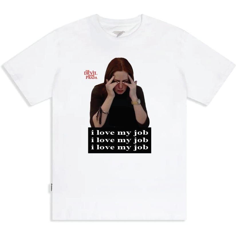 Devil Wears Prada Graphic T-Shirt express your inner Miranda Priestly with this laugh-out-loud Devil Wears Prada inspired graphic tee. The “i love my job” quote — repeated three times in bold text alongside a hilariously stressed character — captures the perfect irony of modern work life and will resonate with anyone who has ever had a tough day at the office.